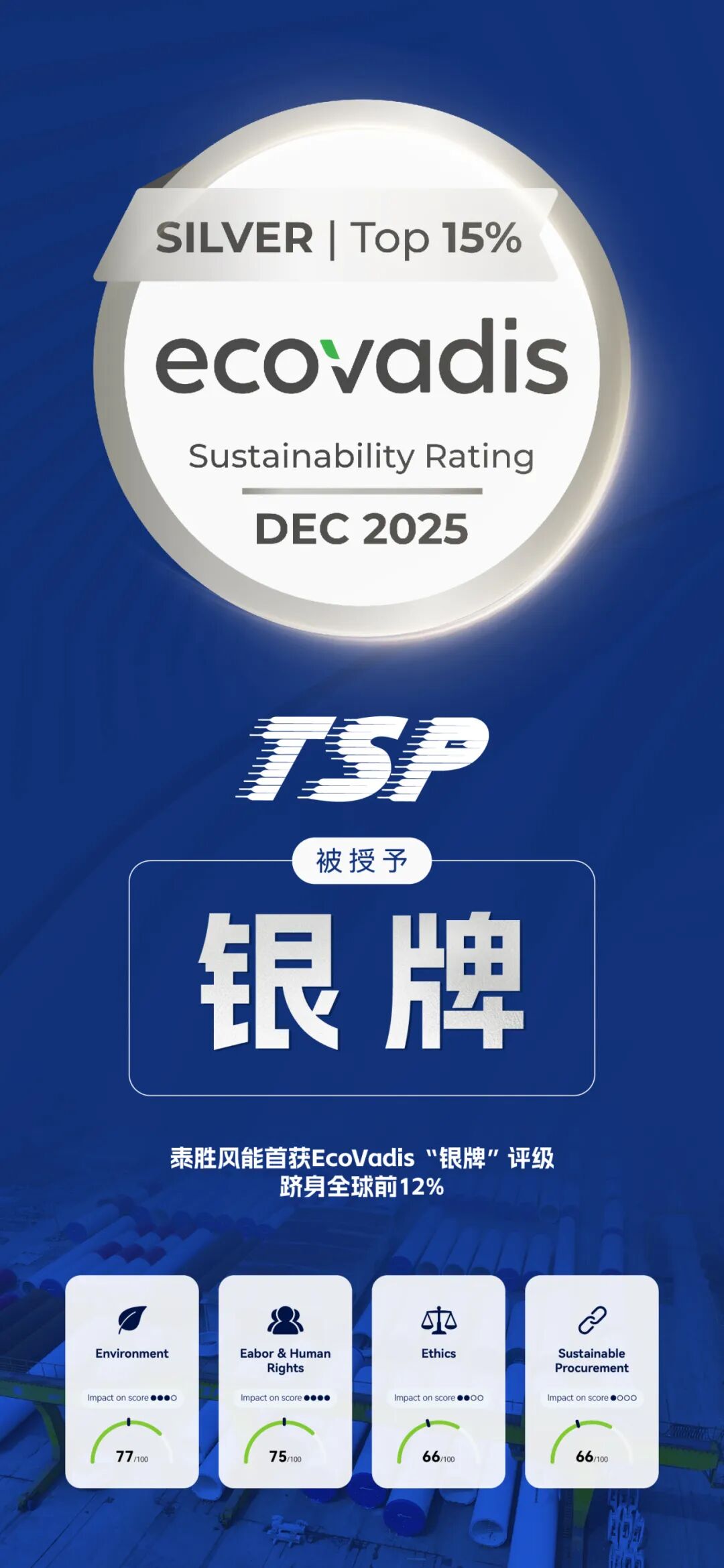 近日,全球权威可持续发展评级机构EcoVadis公布评估结果,泰胜风能集团股份有限公司(下称“泰胜风能”)凭借在环境保护、劳工权益、商业道德及价值链协同等方面的卓越表现,首次参评便一举荣获银牌认证(综合得分73分),在全球逾15万家参评企业...