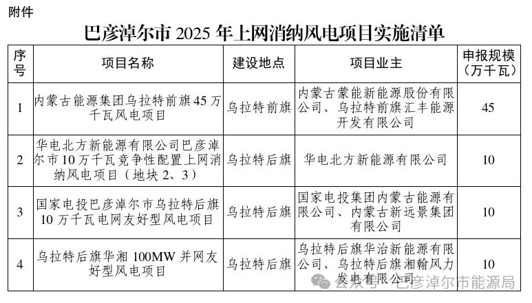北极星风力发电网获悉,12月24日,内蒙古能源局发布《巴彦淖尔市2025年上网消纳风电项目优选结果的公示》。据悉,12月8日,巴彦淖尔市能源局发布《关于开展巴彦淖尔市2025年竞争性配置上网消纳风电项目申报工作的公告》。相关阅读:内蒙古巴彦...