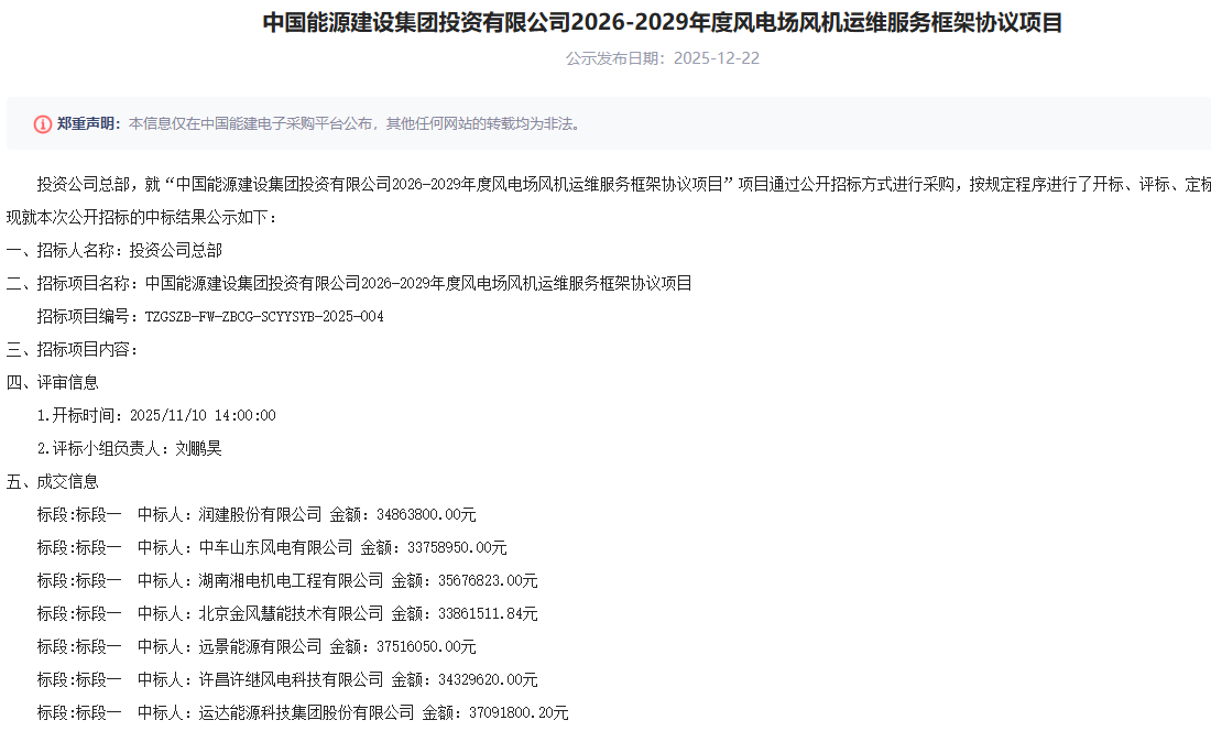 北极星风力发电网获悉,12月22日,中国能源建设集团投资有限公司2026-2029年度风电场风机运维服务框架协议项目中标结果公示,金风慧能、运达股份、远景能源、润建股份、湖南湘电、许继风电、中车山东风电中标。项目概况和招标范围:项目规模:投...