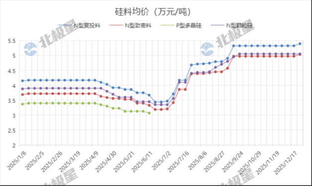 据安泰科统计,本周多晶硅n型复投料成交价格区间为5.0-5.6万元/吨,成交均价为5.39万元/吨,周环比上涨1.32%。n型颗粒硅成交价格区间为5.0-5.1万元/吨,成交均价为5.05万元/吨,环比持平。硅业分会分析,本周国内多晶硅市场...