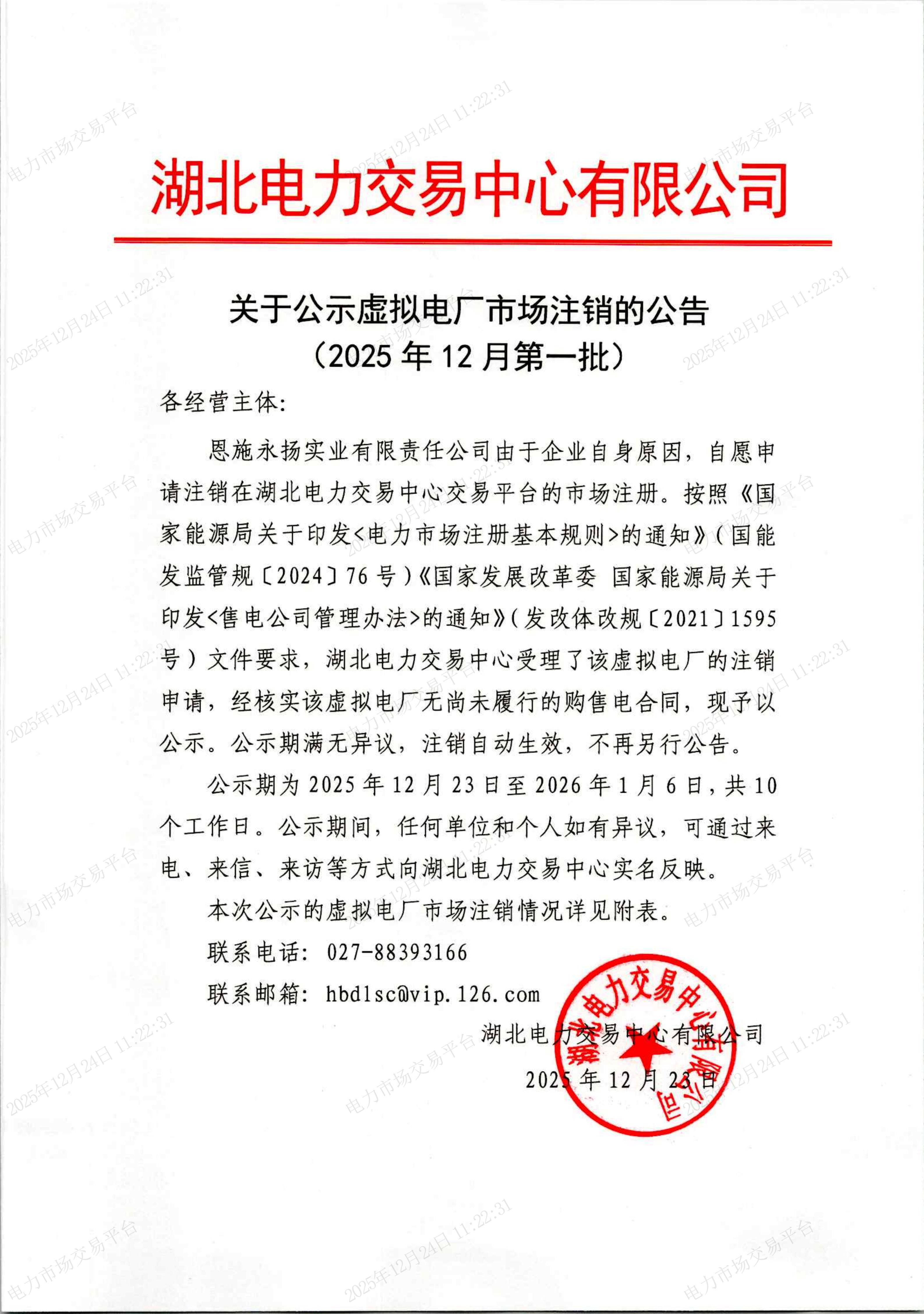 北极星电力市场网获悉,湖北电力交易中心公示虚拟电厂市场注销的公告(2025年12月第一批),恩施永扬实业有限责任公司由于企业自身原因,自愿申请注销在湖北电力交易中心交易平台的市场注册。湖北电力交易中心受理了该虚拟电厂的注销申请,经核实该虚拟...