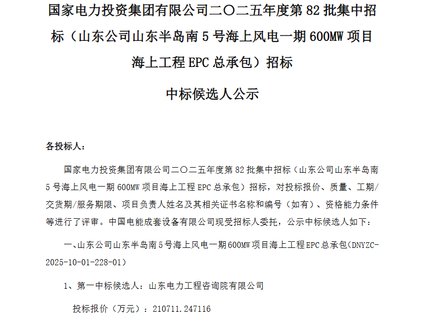 北极星风力发电网获悉,近日,国家电投发布《山东公司山东半岛南5号海上风电一期600MW项目海上工程EPC总承包招标中标候选人公示》。《公示》显示,该项目第一中标候选人:山东电力工程咨询院有限公司,投标报价报价为210711.247116万元...