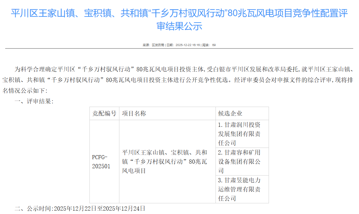 北极星风力发电网获悉,近日,甘肃省白银市平川区王家山镇、宝积镇、共和镇“千乡万村驭风行动”80兆瓦风电项目竞争性配置评审结果公示,甘肃润川投资发展集团有限责任公司、甘肃容和矿用设备集团有限公司、甘肃昱能电力运维管理有限责任公司三家企业入选。...