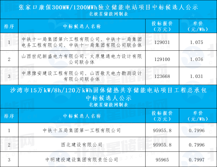 北极星储能网讯:2025年12月23日,新疆、河北两地两大储能项目中标候选人公布,两项目总规模达450MW/2.4GWh,两个项目第一名均为中铁旗下企业,分别为中铁十一局和中铁十五局,两个项目中标总额达22.5亿元。其中河北张家口康保300...