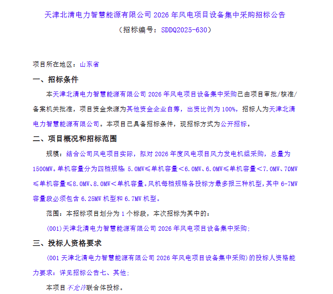 北极星风力发电网获悉,12月23日,中国招标投标公共服务平台发布《天津北清电力智慧能源有限公司2026年风电项目设备集中采购招标公告》。《招标公告》显示,本次招标总量为1500MW。单机容量分为四档规格:5.0MW≤单机容量...