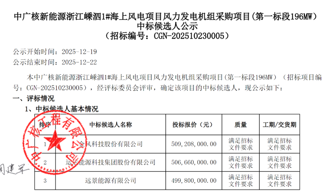 北极星风力发电网获悉,12月19日,中广核新能源浙江嵊泗1#海上风电项目风力发电机组采购项目中标候选人公示,规模共计396MW,金风科技预中标,投标总价10.3亿元。项目概况:中广核嵊泗1#海上风电项目位于浙江省舟山市嵊泗县滩浒岛南侧海域,...