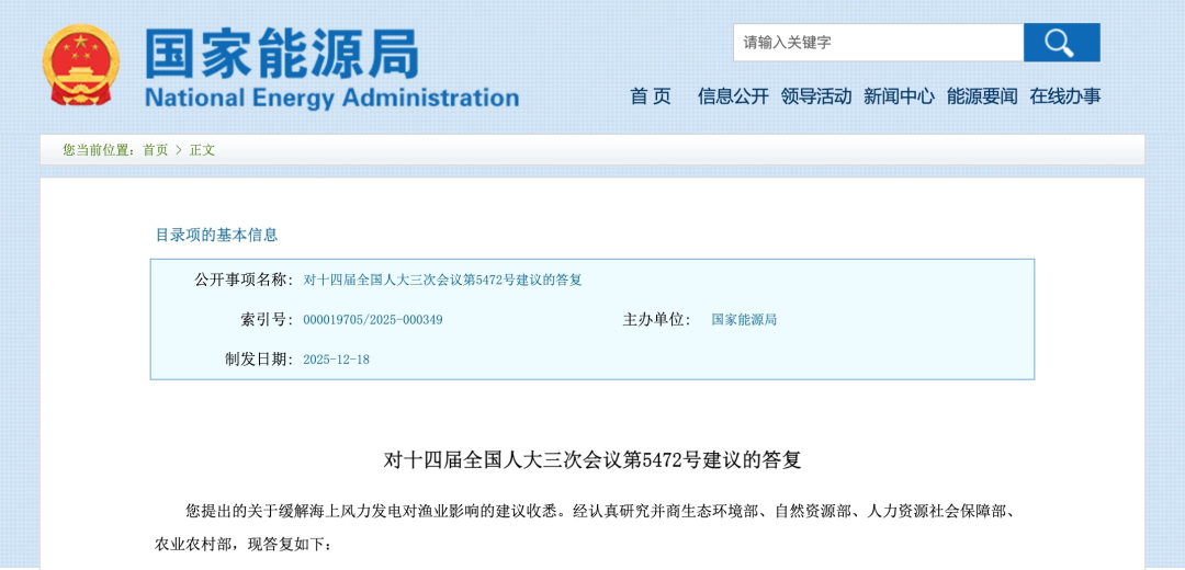 12月18日,国家能源局网站发布《对十四届全国人大三次会议第5472号建议的答复》,针对关于缓解海上风力发电对渔业影响的建议,从科学规划与选址、生态补偿机制、技术创新与应用、渔民培训与转型支持等四方面进行了详细的答复。对十四届全国人大三次会...