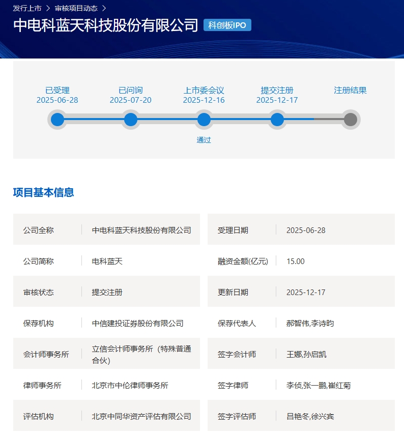 12月17日,上交所官网显示,中电科蓝天科技股份有限公司(下称“电科蓝天”)IPO状态已变更为提交注册,拟登陆科创板。据公开信息,公司上市申请于2025年6月28日受理,12月16日IPO过会,12月17日同步提交注册并发布首次公开发行股票...