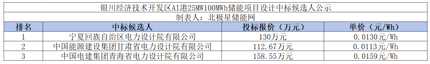 2025年12月17日,宁夏回族自治区银川经济技术开发区AI港25MW/100MWh储能项目设计中标候选人公示。第一中标候选人为宁夏回族自治区电力设计院有限公司,投标报价为1300000.00元,折合单价为0.0130元/Wh。第二中标候选...