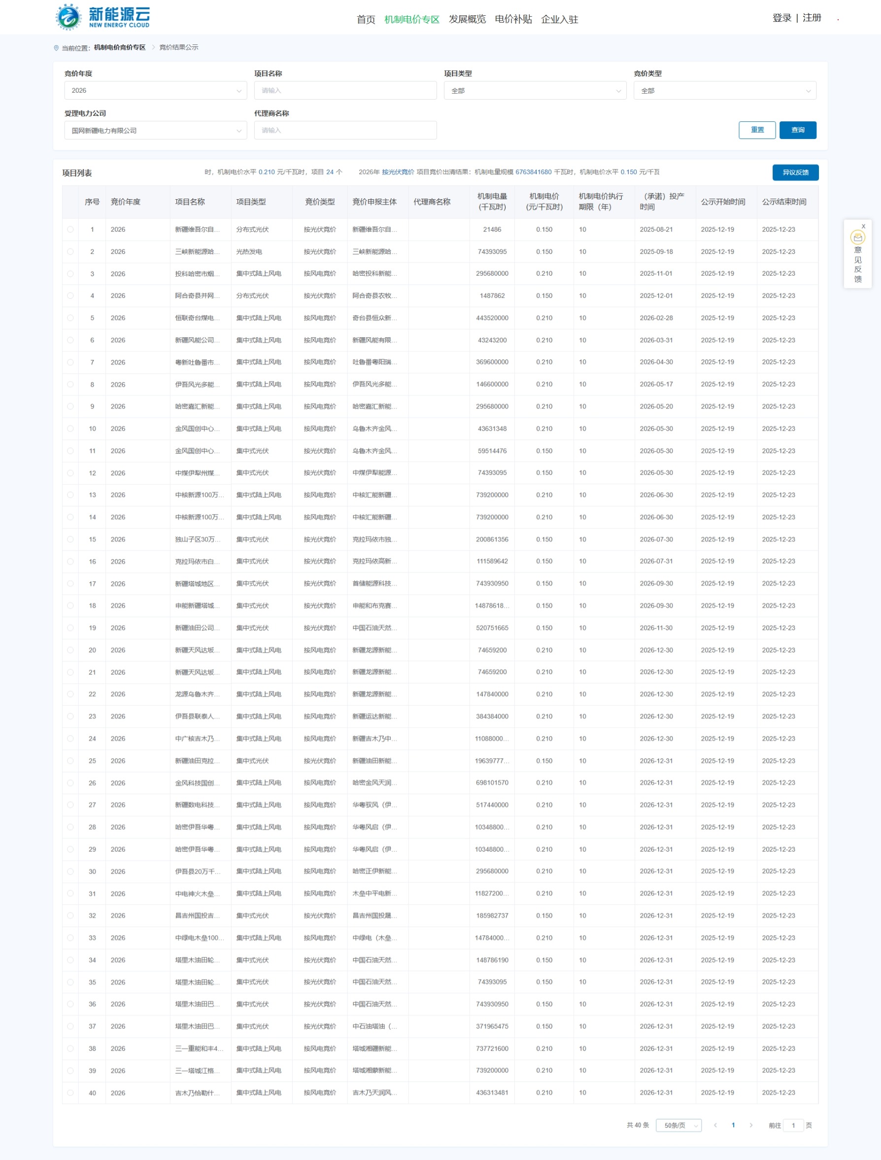 12月19日,国网新能源云平台公示2026年度增量新能源项目机制电价竞价结果,共40个项目入围。其中:2026年按光伏竞价项目竞价出清结果:机制电量规模6763841680千瓦时,机制电价水平0.150元/千瓦时,项目16个;2026年按风...