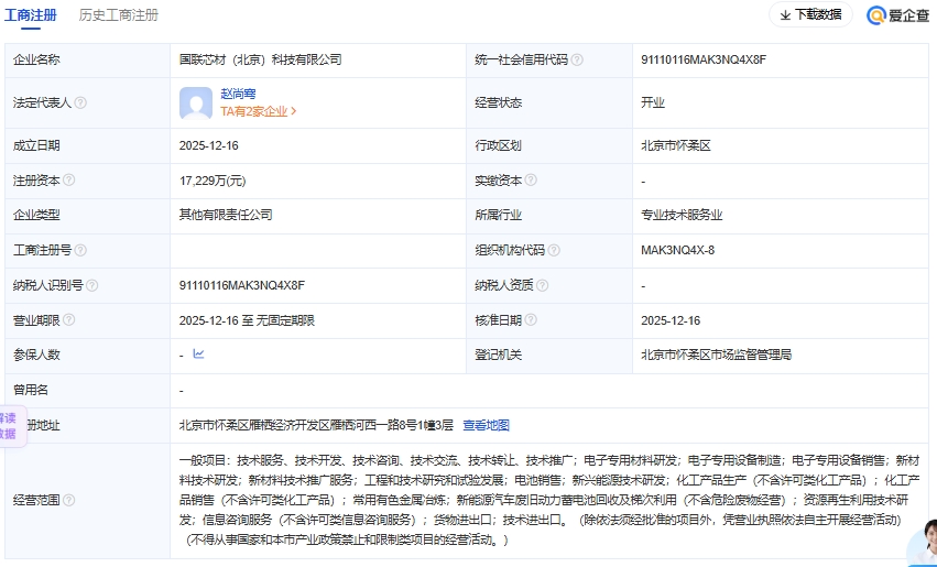2025年12月16日,国联芯材(北京)科技有限公司成立,公司注册地位于北京市怀柔区雁栖经济开发区,法定代表人为赵尚骞,注册资本达17229万元。该公司由四家企业共同出资设立,中国联汽车动力电池研究院有限责任公司作为大股东持股35%,认缴出...