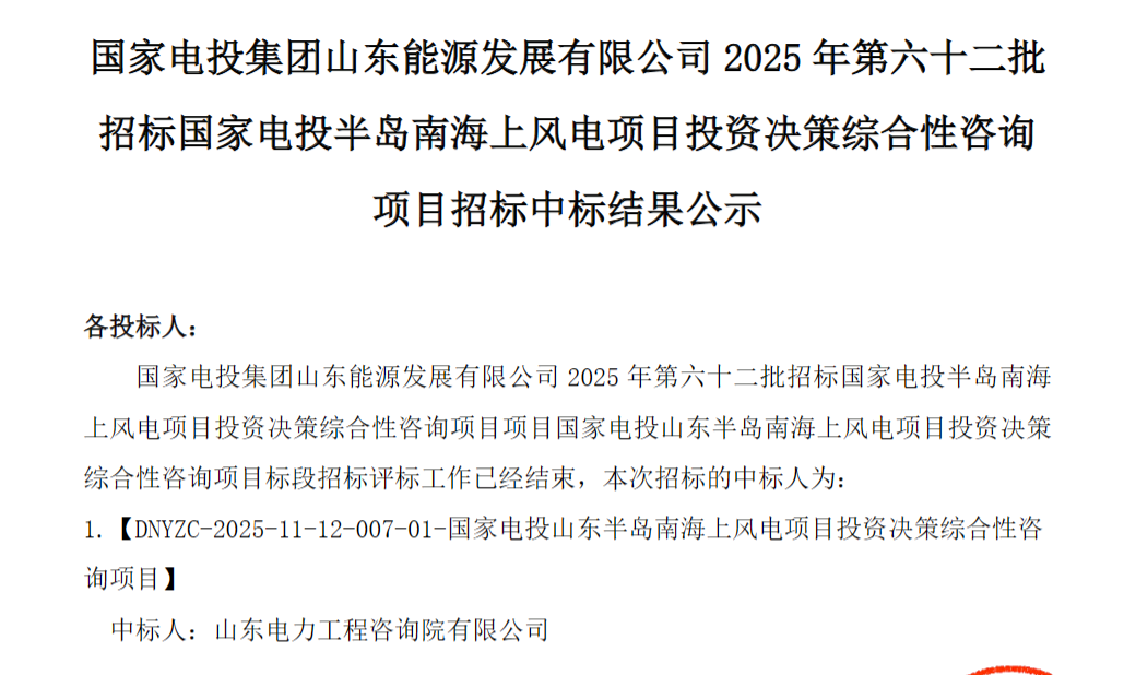 12月16日,国家电投集团山东能源发展有限公司2025年第六十二批招标国家电投半岛南海上风电项目投资决策综合性咨询项目中标结果公示。公告显示,山东电力工程咨询院有限公司成功中标该项目,中标价格为17620万元。招标公告显示,国家电投半岛南海...