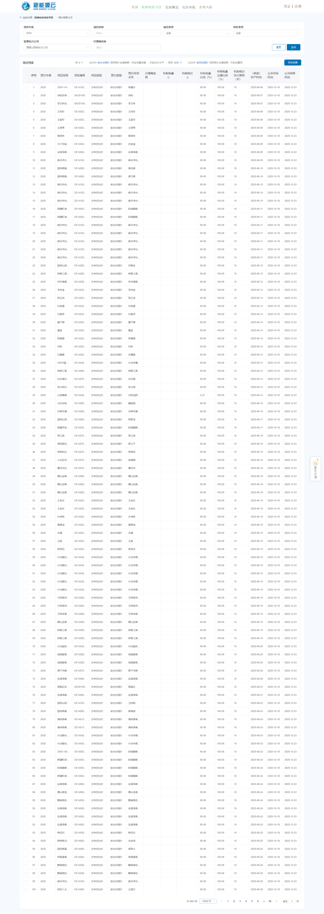 12月19日,国网新能源云公示2025年度山西省增量新能源项目机制电价竞价结果,共4963个新能源项目入围,其中:2025年按光伏竞价项目竞价出清结果:机制电量规模3975000.115兆瓦时,机制电价水平319.990元/兆瓦时,项目49...