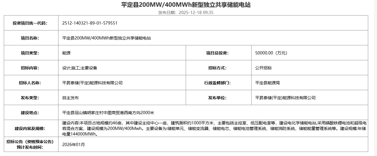 北极星储能网获悉,12月18日,平定县200MW/400MWh新型独立共享储能电站招标发布。据了解,招标人为平昇泰储(平定)能源科技有限公司,建设地点为平定县冠山镇胡家庄村中图商贸港西南方向2000米,项目总投资为50000.00万元,折合...