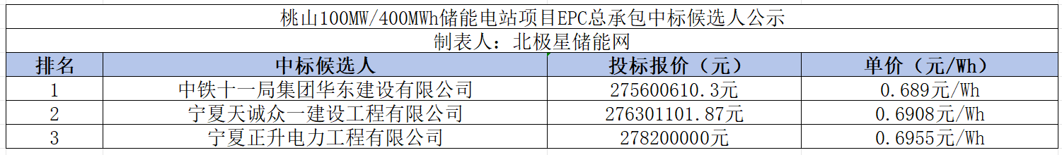 北极星储能网获悉,12月17日,桃山100MW/400MWh储能电站项目EPC总承包中标候选人公示。据公示,第一中标候选人为中铁十一局集团华东建设有限公司,投标报价为275600610.3元,折合单价0.689元/Wh;第二中标候选人为宁夏...