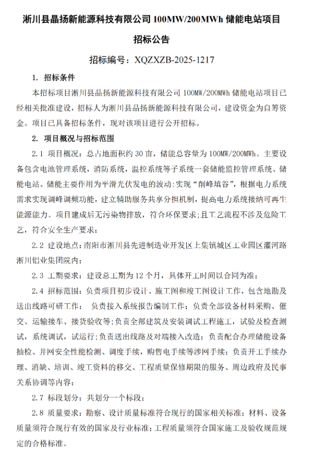 北极星储能网获悉,12月17日,淅川县晶扬新能源科技有限公司100MW/200MWh储能电站项目招标公告发布。据公告,该项目招标人为淅川县晶扬新能源科技有限公司。项目总占地面积约30亩,储能总容量为100MW/200MWh。主要设备包含电池...