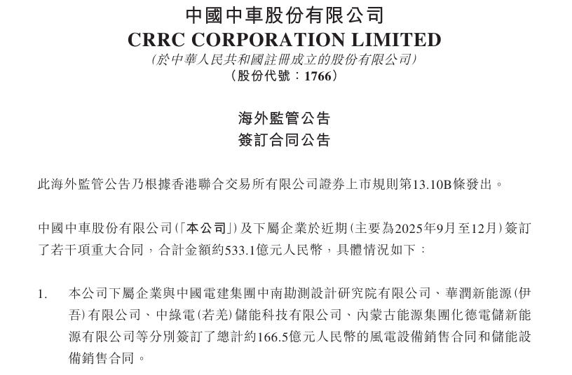 北极星储能网获悉,12月17日,中国中车发布公告,披露其签订533.1亿元合同。其中,公司下属企业与中国电建集团中南勘测设计院有限公司、华润新能源(伊吾)有限公司、中绿电(若羌)储能科技有限公司、内蒙古能源集团化德电储新能源有限公司等分别签...