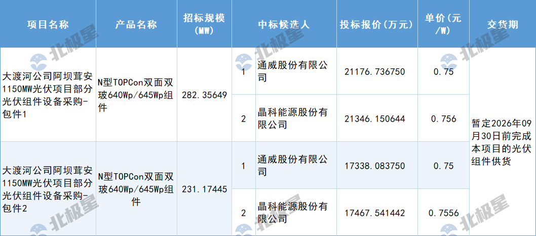 12月17日,大渡河公司阿坝茸安1150MW光伏项目部分光伏组件设备采购公开招标中标候选人公示,入围企业通威股份有限公司、晶科能源股份有限公司,单价区间在0.75-0.756元/W。本次招标范围为阿坝茸安1150MW光伏项目部分光伏组件设备...