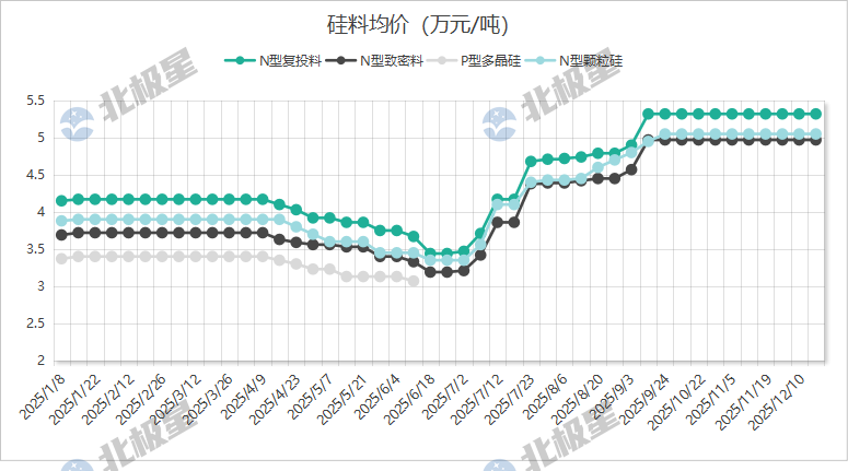 12月17日,硅业分会发布最新硅料价格,本周国内多晶硅市场呈现“成交清淡、报价探涨”的局面。其中,n型复投料成交价格区间为4.9-5.5万元/吨,成交均价为5.32万元/吨,环比持平。n型颗粒硅成交价格区间为5.0-5.1万元/吨,成交均价...