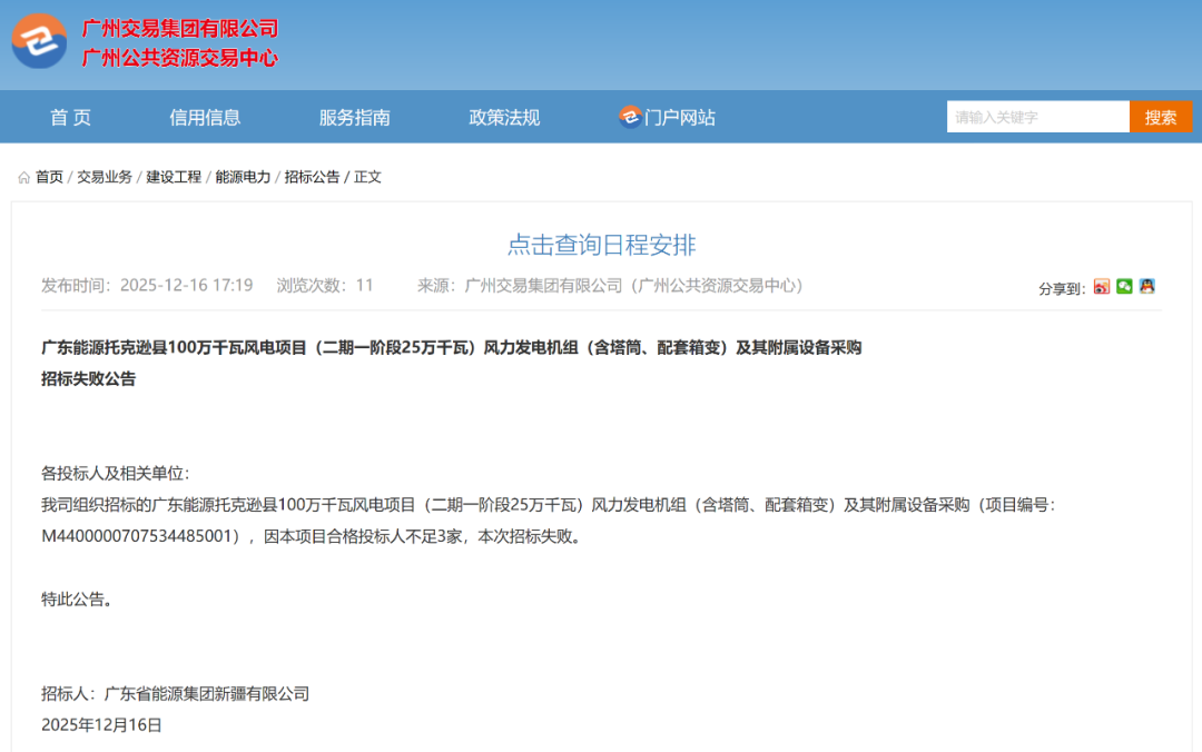 北极星风力发电网获悉,12月16日,广东能源托克逊县100万千瓦风电项目(二期一阶段25万千瓦)风力发电机组(含塔筒、配套箱变)及其附属设备采购招标失败公告,公告称因本项目合格投标人不足3家,本次招标失败。广东能源托克逊县100万千瓦风电项...