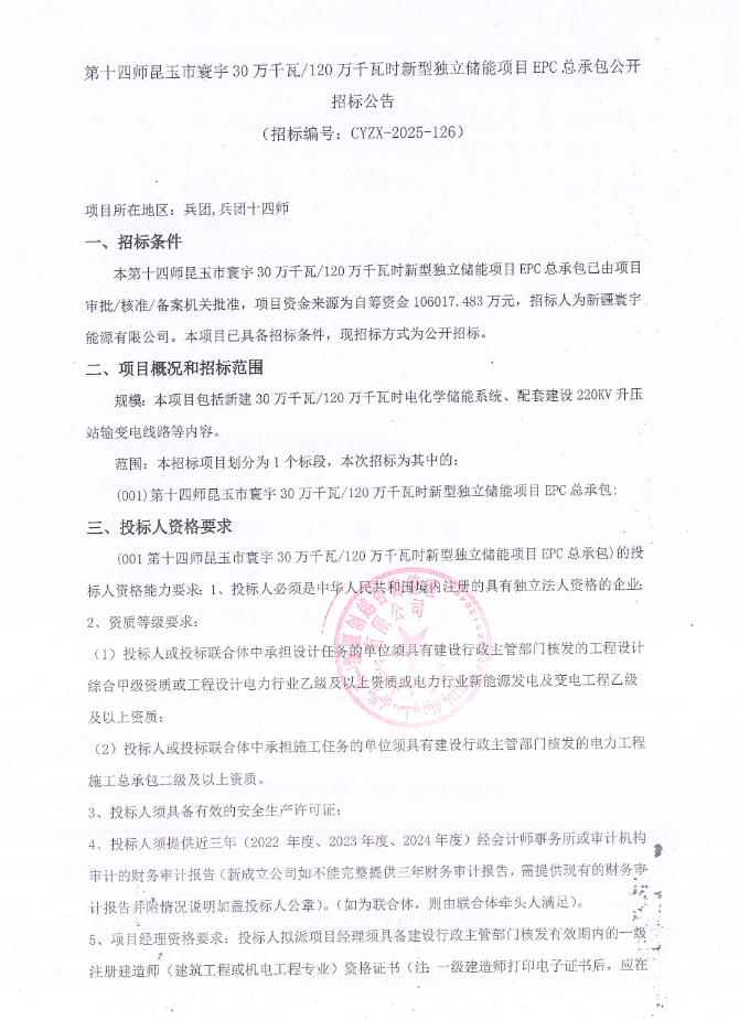 北极星储能网获悉,12月15日,第十四师昆玉市寰宇30万千瓦/120万千瓦时新型独立储能项目EPC总承包公开招标公告发布。该项目招标人为新疆寰宇能源有限公司。项目概况及招标范围如下。项目位于新疆生产建设兵团第十四师昆玉市,项目选址于昆玉市城...