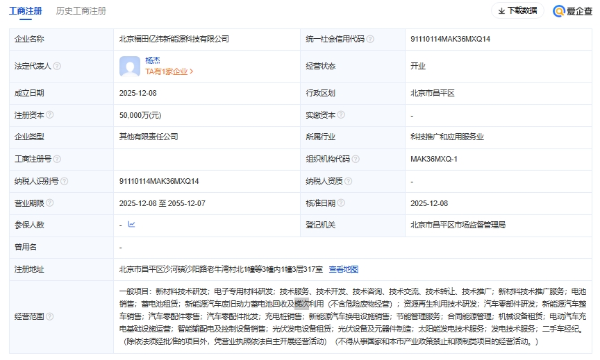 2025年12月8日,北京福田亿纬新能源科技有限公司由北汽福田汽车股份有限公司与惠州亿纬锂能股份有限公司合资成立。该公司注册资本5亿元,由双方各认缴2.5亿元,持股比例均为50%,认缴出资日期为2028年12月31日,法定代表人为杨杰,注册...