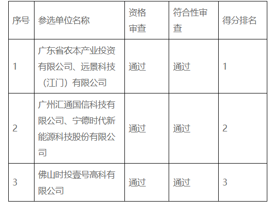 北极星储能网获悉,12月15日,广东台山市发展和改革局发布台山市发兴站独立储能电站项目竞争配置结果的公告,共有3家进入评审结果,排名第一的是广东省农本产业投资有限公司、远景科技(江门)有限公司、排名第二的是广州汇通国信科技有限公司、宁德时代...