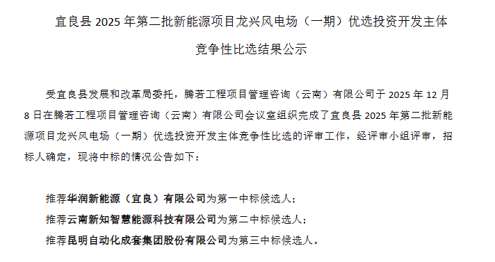 北极星风力发电网获悉,近日,云南宜良县2025年第二批新能源项目龙兴风电场(一期)优选投资开发主体比选结果公示。根据公示,龙兴风电场(一期)项目第一中标候选人为华润新能源(宜良)有限公司。招标公告显示,该项目为云南2025年第二批新能源项目...