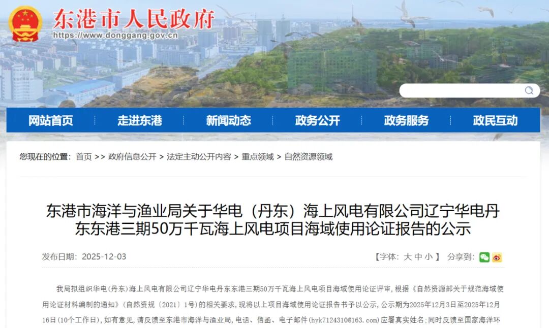 北极星风力发电网获悉,近日,辽宁省丹东市东港市海洋与渔业局发布《关于华电(丹东)海上风电有限公司辽宁华电丹东东港三期50万千瓦海上风电项目海域使用论证报告的公示》。根据公示,辽宁华电丹东东港三期50万千瓦海上风电项目目位于辽宁省东港市南部海...