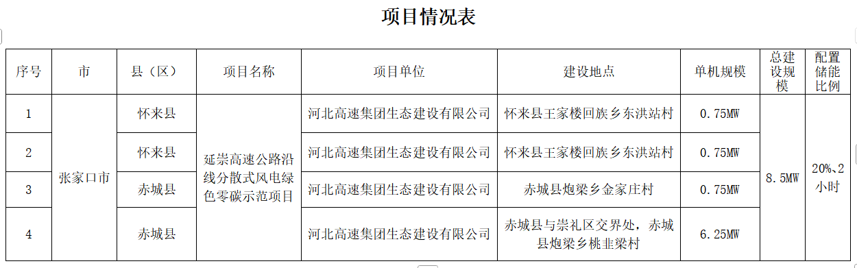 北极星储能网获悉,12月11日,河北省发展和改革委员会发布延崇高速公路沿线分散式风电绿色零碳示范项目有关情况公示,拟安排项目纳入2025年风电、光伏发电年度开发建设方案。公示时间为2025年12月11日至12月15日。其中,共有4个项目,要...