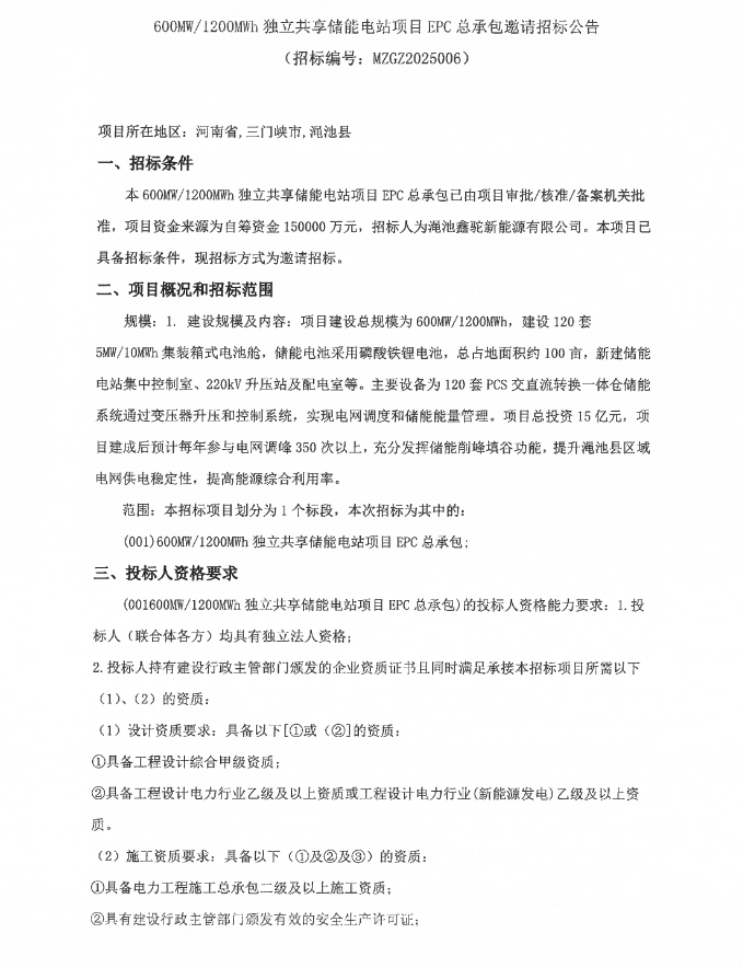 北极星储能网获悉,12月10日,600MW/1200MWh独立共享储能电站项目EPC总承包邀请招标公告发布。据公告,该项目招标人为渑池鑫驼新能源有限公司,项目所在地位于河南省三门峡市渑池县,项目资金为150000万元,折合单价为1.25元/...