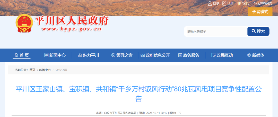 北极星风力发电网获悉,12月11日,甘肃省白银市平川区发布《平川区王家山镇、宝积镇、共和镇“千乡万村驭风行动”80MW风电项目竞争性配置公告》。公告显示,平川区王家山镇、宝积镇、共和镇“千乡万村驭风行动”80MW风电项目位于平川区王家山镇...
