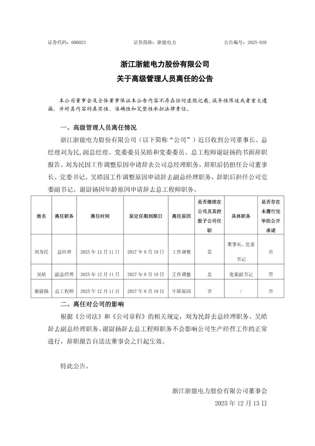 北极星风力发电网获悉,12月13日,浙能电力发布公告称,公司近日收到公司董事长、总经理刘为民,副总经理、党委委员吴皓和党委委员、总工程师谢尉扬的书面辞职报告。刘为民因工作调整原因申请辞去公司总经理职务,辞职后仍担任公司董事长、党委书记。吴皓...