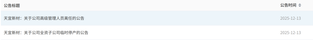 12月13日,天宜新材连发两则公告。一则公告为,天宜新材连董事会于近日收到公司总裁孟利先生、副总裁啜艳明先生提交的书面辞任报告,孟利先生、啜艳明先生因个人原因分别申请辞去公司总裁职务、副总裁职务。辞任后,孟利先生、啜艳明先生将不再担任公司的...