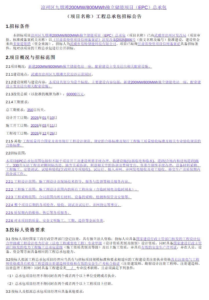 北极星储能网获悉,12月11日,凉州区九墩滩200MW/800MWh独立储能项目(EPC)总承包招标公告发布。据了解,本招标项目招标人为武威市易特储能科技有限公司。建设地点位于武威市凉州区九墩滩光伏治沙示范园区,投资总额(以批准的概算为准)...