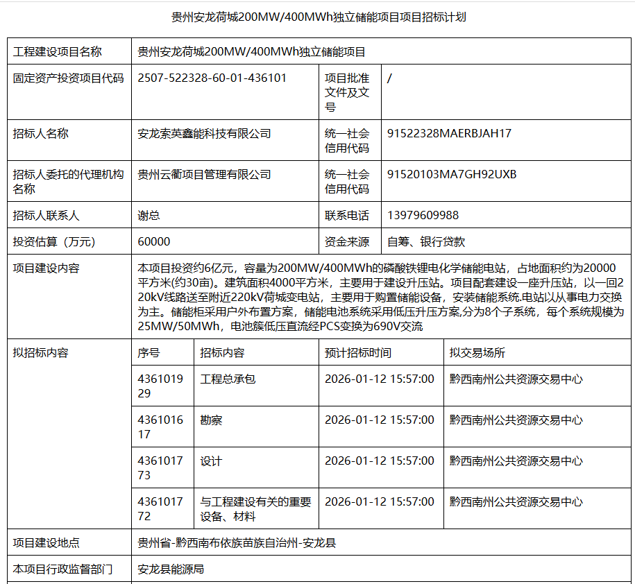 12月11日,安龙索英鑫能科技有限公司发布贵州安龙荷城200MW/400MWh独立储能项目项目招标计划,招标内容为工程总承包,项目计划于2026年1月12日正式招标。本项目投资约6亿元,折合单价1.5元/Wh。项目容量为200MW/400M...
