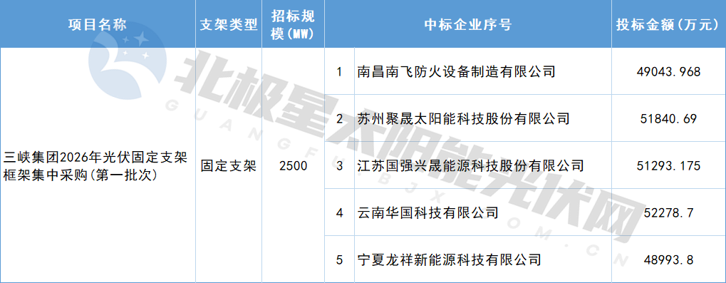 12月11日,三峡集团2026年光伏固定支架框架集中采购(第一批次)中标候选人公示,入围企业共计5家:南昌南飞防火设备制造有限公司、苏州聚晟太阳能科技股份有限公司、江苏国强兴晟能源科技股份有限公司、云南华国科技有限公司、宁夏龙祥新能源科技有...