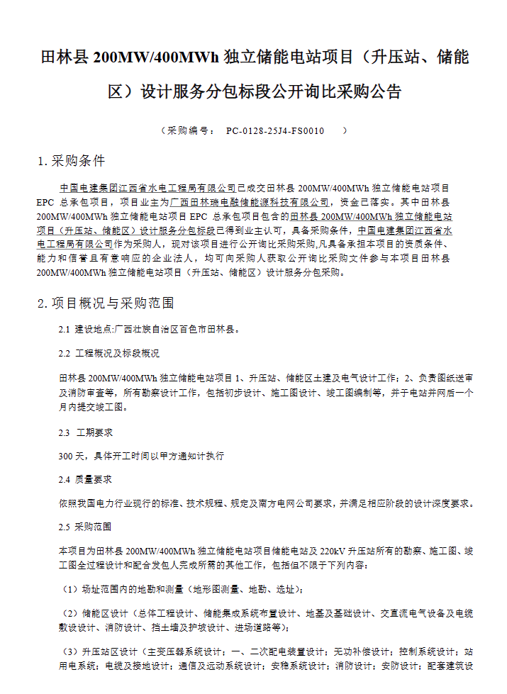 北极星储能网获悉,12月10日,中国电建江西水电公司田林县200MW/400MWh独立储能电站项目EPC总承包工程项目田林县200MW400MWh独立储能电站项目(升压站、储能区)设计分包采购项目公开询比采购公告发布。据公告,该项目业主为广...