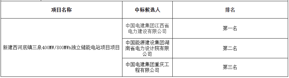 12月9日,新建西河底镇三泉400MW/800MWh独立储能电站项目EPC总承包中标候选人公示。中标候选人第一名为中国电建集团江西省电力建设有限公司,第二名为中国能源建设集团湖南省电力设计院有限公司,第三名为中国电建集团重庆工程有限公司。本...