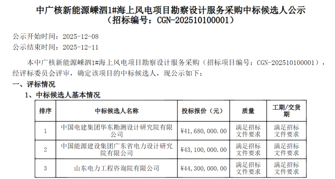 12月8日,中广核发布《中广核新能源嵊泗1#海上风电项目勘察设计服务采购中标候选人公示》的公告。公告显示,第一中标候选人:中国电建集团华东勘测设计研究院有限公司,投标报价:41680000.00元。第二中标候选人:中国能源建设集团广东省电力...