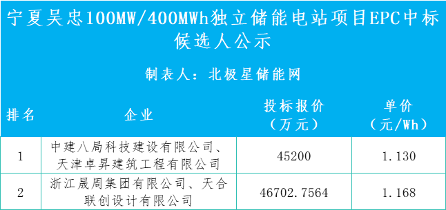 北极星储能网获悉,12月10日,吴忠市融晟全利新能源有限公司100MW/400MWh独立储能电站项目EPC总承包工程中标候选人公示。第一中标候选人为中建八局科技建设有限公司、天津卓昇建筑工程有限公司联合体,投标报价45200万元,折合单价1...