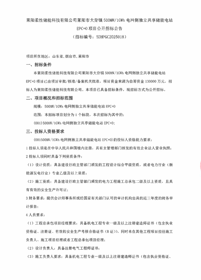 北极星储能网获悉,12月10日,莱阳柔性储能科技有限公司莱阳市大夼镇500MW/1GWh电网侧独立共享储能电站EPC+O项目公开招标公告发布。据悉,该项目招标人为莱阳柔性储能科技有限公司,项目资金来源为自筹资金130000万元。该项目招标范...