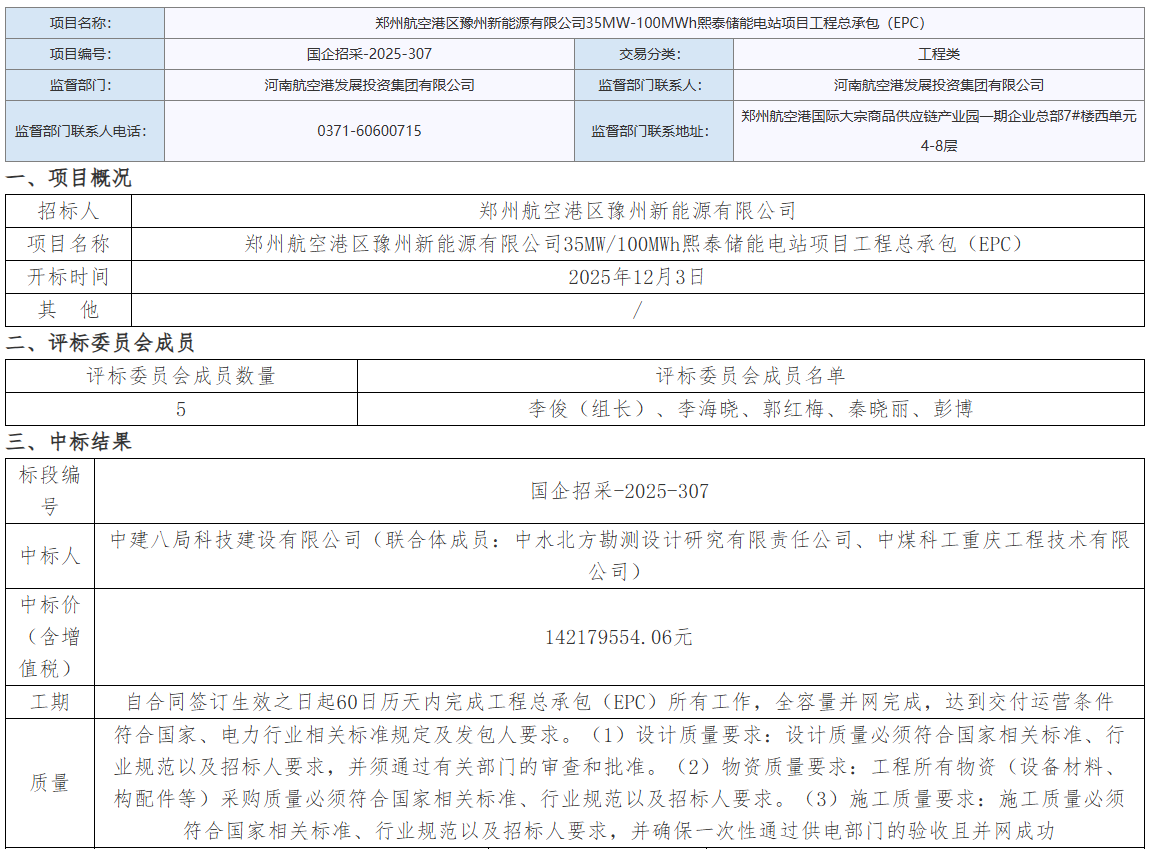 北极星储能网获悉,12月9日,郑州航空港区豫州新能源有限公司35MW/100MWh熙泰储能电站项目工程总承包(EPC)中标结果公告。中建八局科技建设有限公司(联合体成员:中水北方勘测设计研究有限责任公司、中煤科工重庆工程技术有限公司)以14...