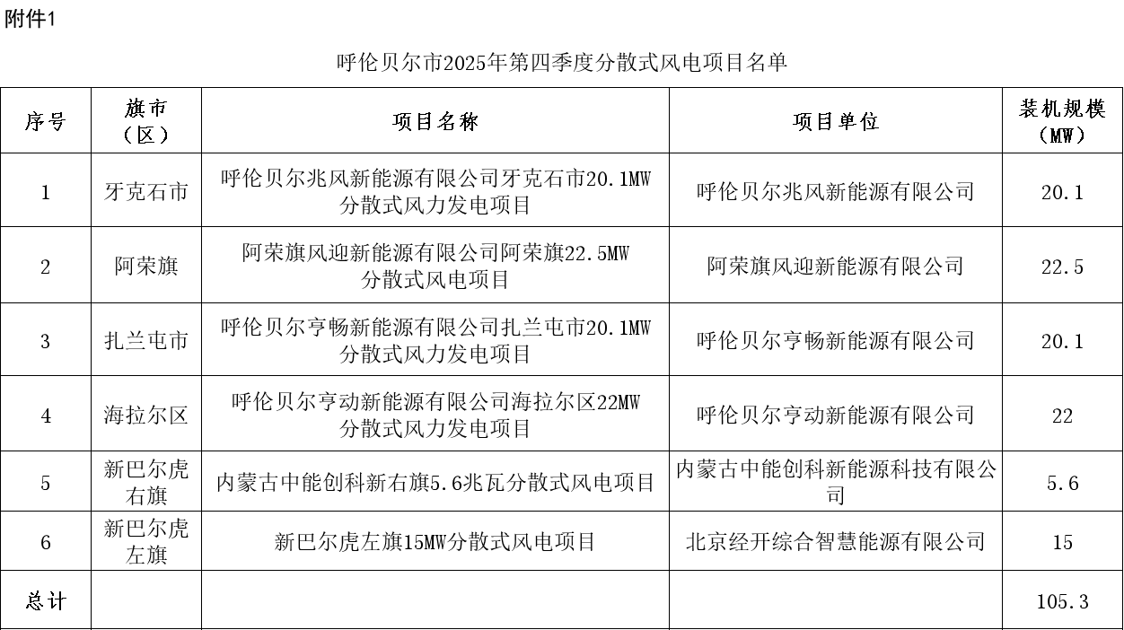 北极星风力发电网获悉,12月9日,呼伦贝尔市能源局发布《关于调整呼伦贝尔市2025年第四季度分布式能源项目名单的公告》。公告指出,根据《呼伦贝尔市能源局关于印发的通知》(呼能源字〔2025〕24号),呼伦贝尔市能源局委托第三方评审机构按照公...