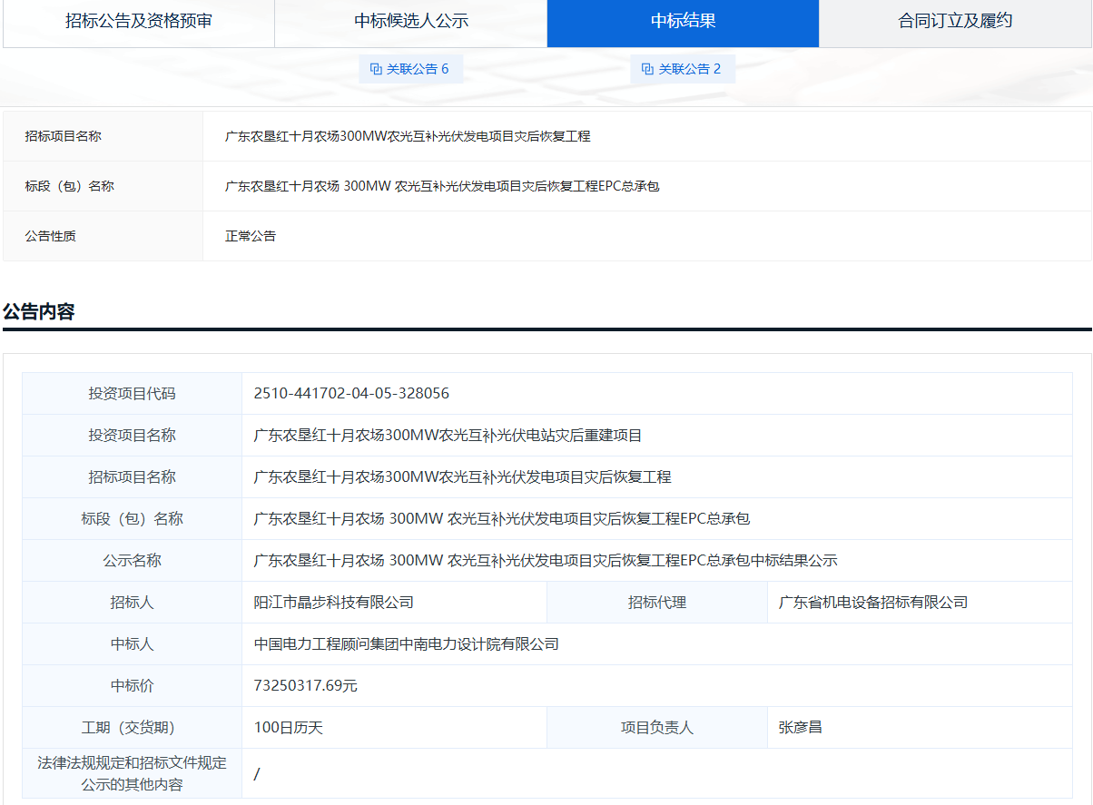 12月9日,广东农垦红十月农场300MW农光互补光伏发电项目灾后恢复工程EPC总承包中标结果公布,项目分为两个标段,标段1中标人为中国电力工程顾问集团中南电力设计院有限公司,中标价格7325.031769万元,单价0.488元/W;标段2中...