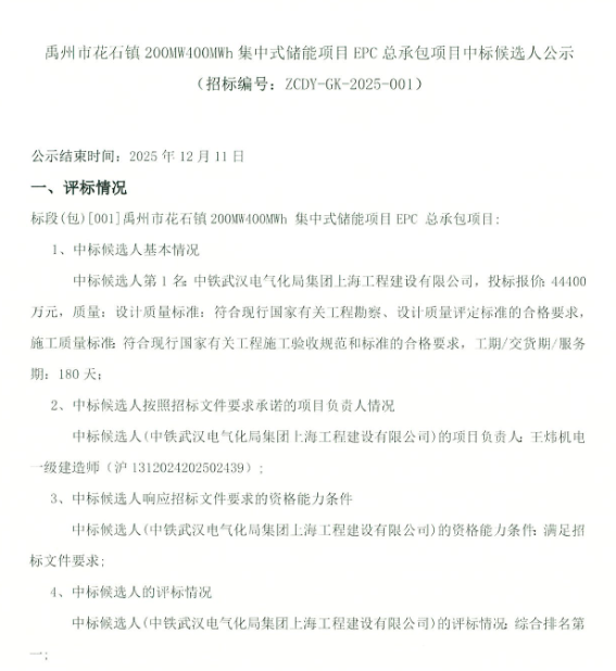 北极星储能网获悉,12月8日,禹州市花石镇200MW400MWh集中式储能项目EPC总承包项目中标候选人公示,中标候选人第1名为中铁武汉电气化局集团上海工程建设有限公司,投标报价44400万元,折合单价1.1元/Wh。项目招标人为中城大有新...