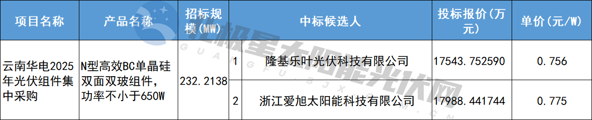 12月5日,云南华电2025年光伏组件集中采购项目中标候选人公示,中标候选人第一名为隆基乐叶光伏科技有限公司,单价0.756元/W。具体如下:招标公告显示,本次采购N型高效BC双面双玻光伏组件,其功率不小于650W,采购规模232.2138...