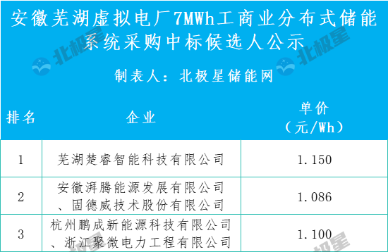 12月2日,城市级虚拟电厂可调资源货物采购安装项目(1包)中标结果公告发布,芜湖楚睿智能科技有限公司以1150元/kWh,即1.15元/Wh中标该项目。据此前公布的中标候选人公示,第一中标候选人为芜湖楚睿智能科技有限公司,投标报价1.150...