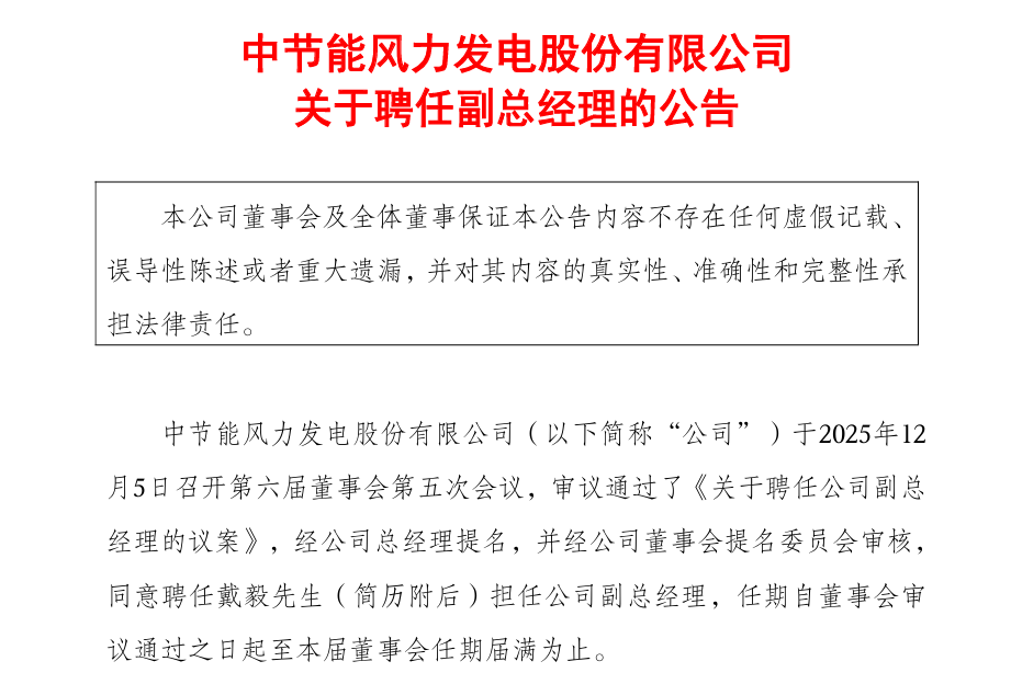 12月6日,中节能风力发电股份有限公司(以下简称“节能风电”)发布《关于聘任副总经理的公告》。公告披露,节能风电于2025年12月5日召开第六届董事会第五次会议,审议通过了《关于聘任公司副总经理的议案》,经公司总经理提名,并经公司董事会提名...