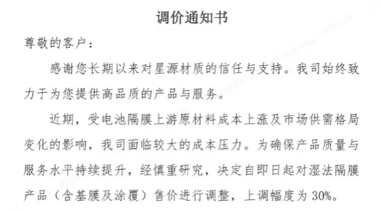 2025需求景气度驱动涨价,临近年末谈价窗口,锂电产业链边际变化不断。近日,隔膜头部企业星源材质宣布其湿法隔膜产品售价进行调整,上调幅度为30%,由于涨价函的涨价幅度较大,引起了市场的高度关注。实际上,隔膜行业于2025年8月开启反转行情,...